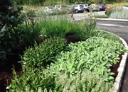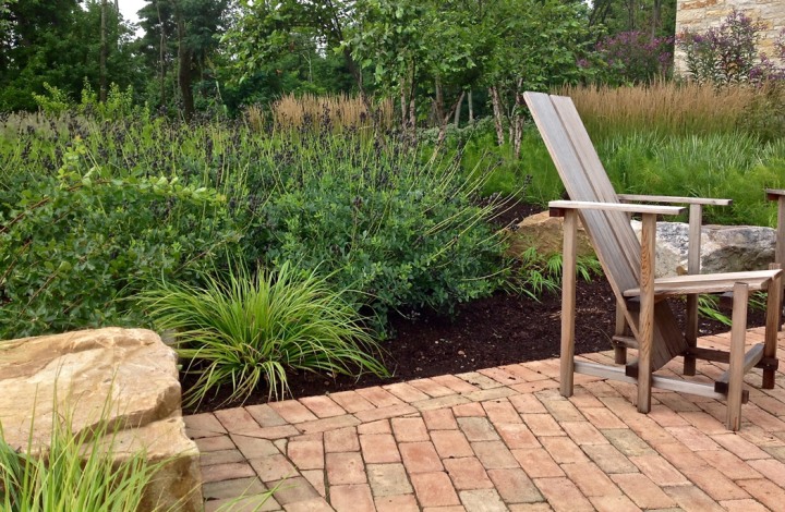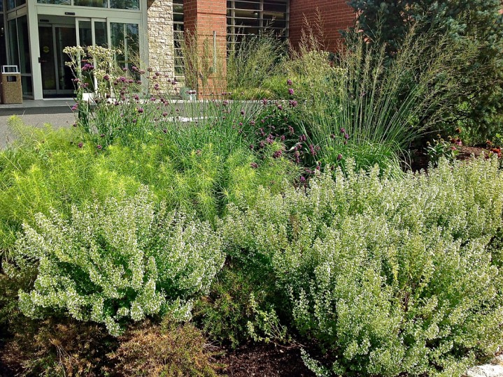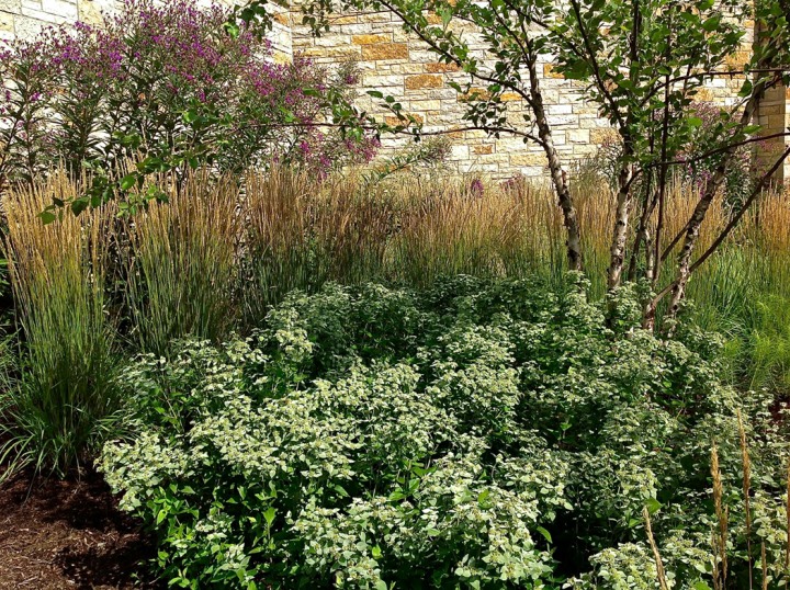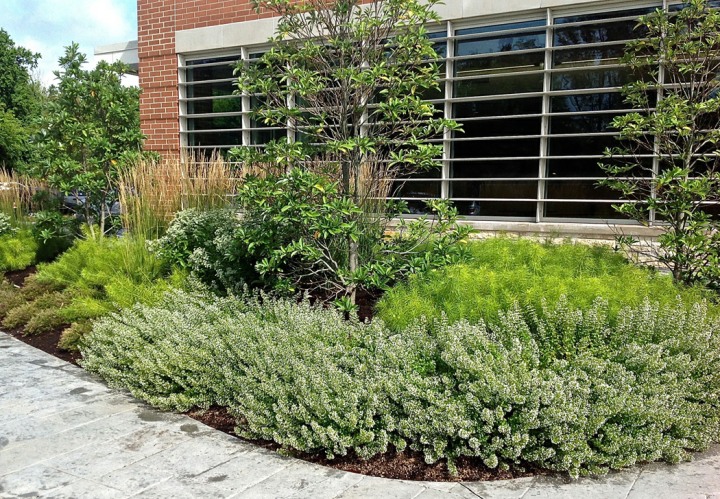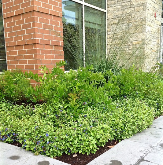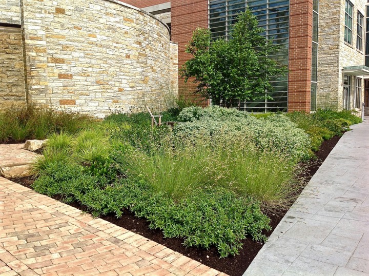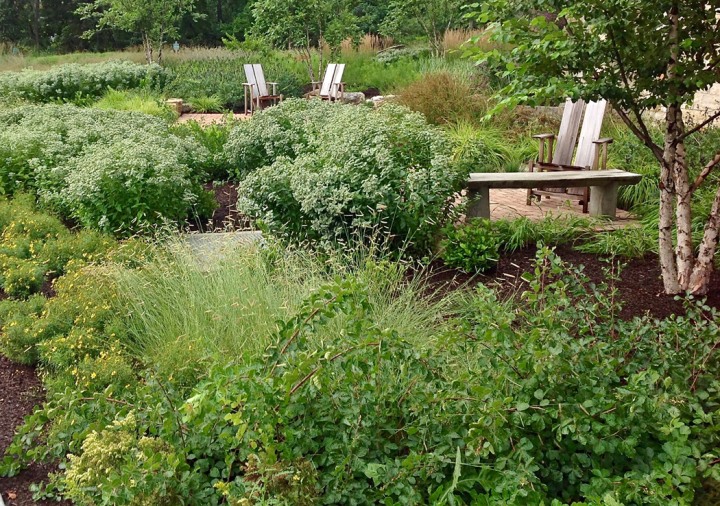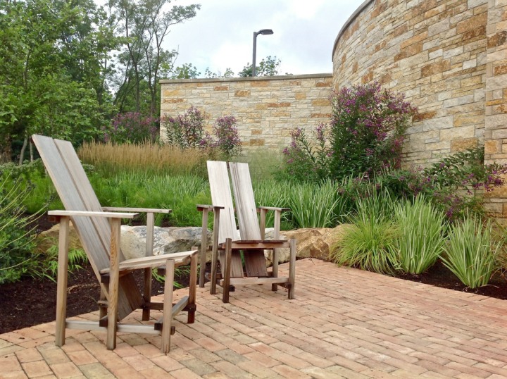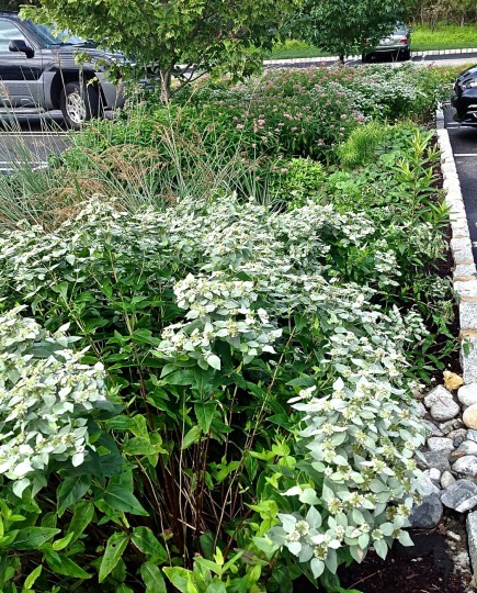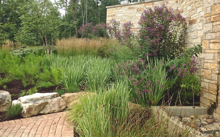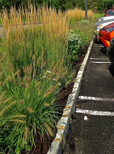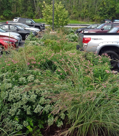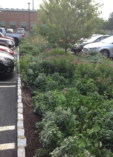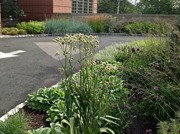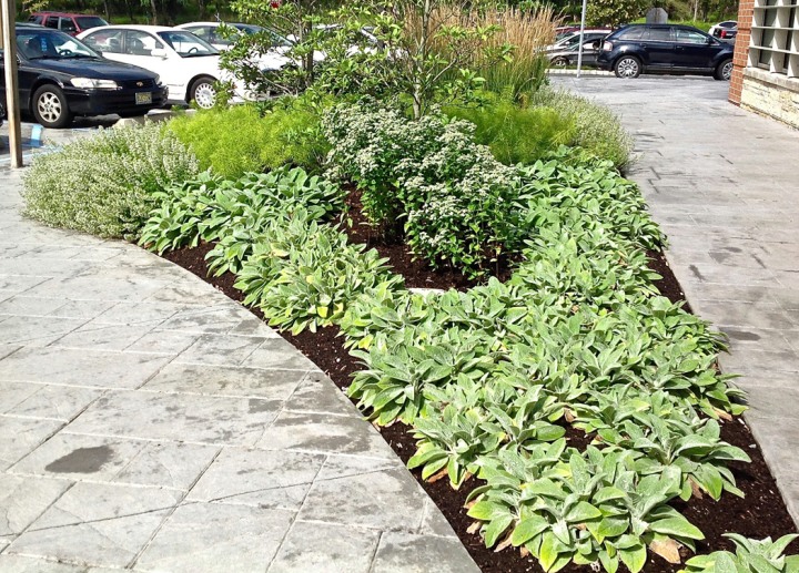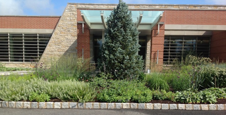 Installed in the fall of 2014, the campus at this orthopedic institute in Flemington, NJ features a waterfall, seating area, parking islands and infiltration basins. Plants consist mostly of native species. This site is very heavily populated with deer.