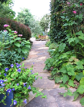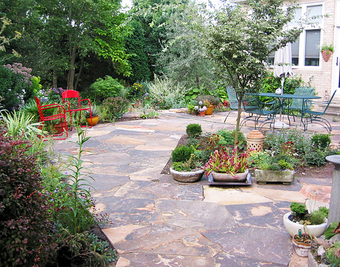 This residence features a stone patio surrounded by attractive plantings. The central tree will grow to provide ample shade during summer.