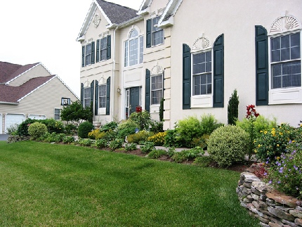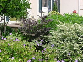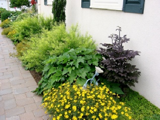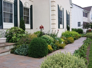 Elements of formality provide a clean look for this front entry garden. Drifts of long flowering perennials soften the lines, adding color and texture throughout the seasons.