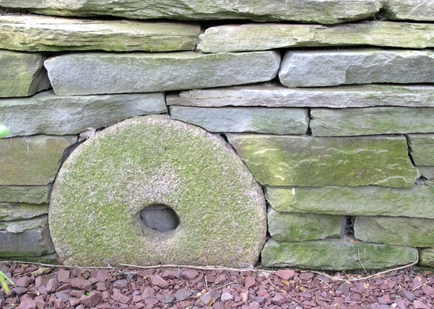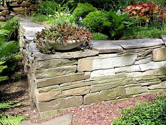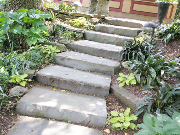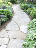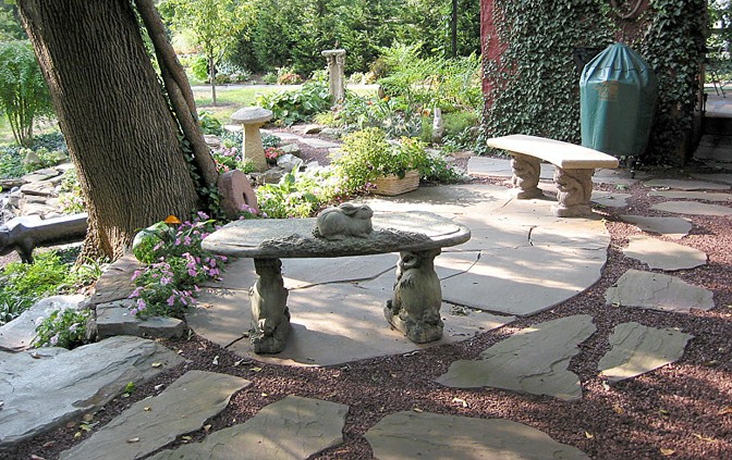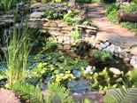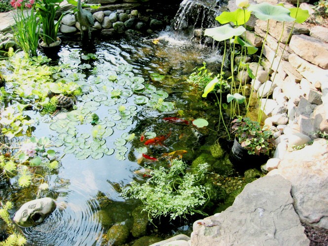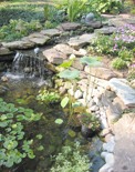 This residential landscape includes a planted koi pond with a waterfall, a small sitting patio, and multiple stone walks.